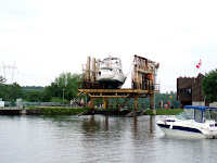 We left Orillia early in the morning so that we could spend a little time studying this next lock called the Big Chute. It started out as a railway transport, but was never converted to a regular lock because it was thought that this type of conveyance would prevent the spread of the sea lamprey to the Great Lakes. This is a view from the top down to the lower waterway. We have to go down THIS??????
